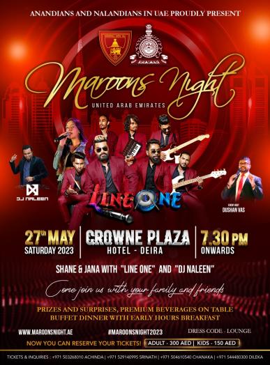 Following the success of past 8 years, the 9th Edition of “Maroons Night 2023” is scheduled to be held on 27th May 2023 at Crown Plaza Hotel, Deira - Dubai . Second to none of similar events in the UAE, Maroons Night 2023 is expected to attract around 450 Sri Lankan professionals with their families, representing a vast cross section of the ‘elite’ Sri Lankan community living in the UAE.